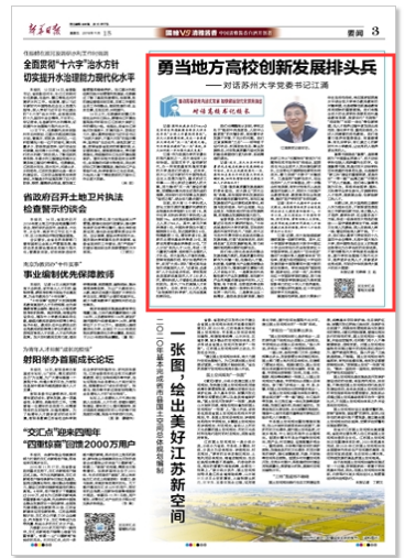 长期以来,苏大坚持把立德树人作为根本任务,不断探索思想政治工作新途径新方法,将之融入人才培养、教学科研、社会服务各个方面,形成一些具有苏大特色的做法——坚守课堂教育主干线、织就文化育人风景线、深入实践育人第一线、铺设网络育人新干线。下一步,我们将认真学习贯彻党的十九届四中全会精神,扎根中国大地办大学,把中国特色社会主义的制度优势转化为办学治校的实际成果,不断完善现代大学制度和治理体系,提升学校治理能力现代化水平,培养更多优秀人才,贡献更多优秀成果,书写好中华民族伟大复兴的苏大篇章!
