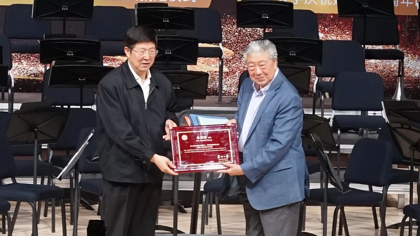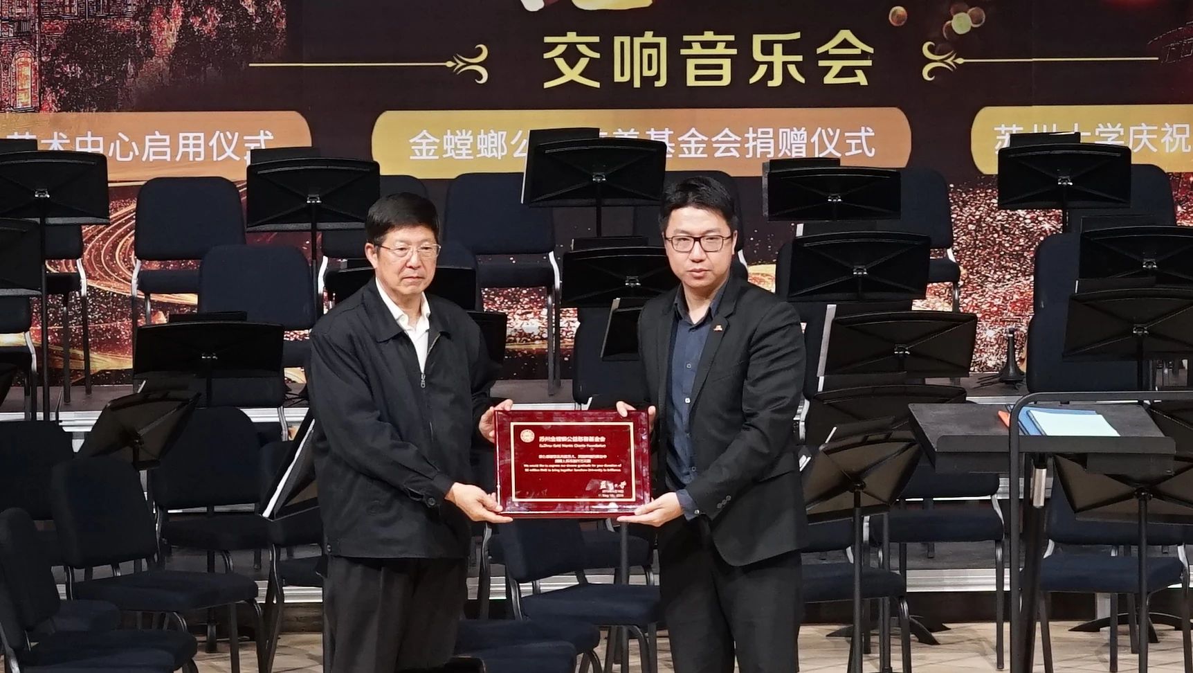 江苏省慈善总会会长、苏州大学董事会董事长蒋宏坤先生向朱恩馀先生颁发捐赠纪念牌