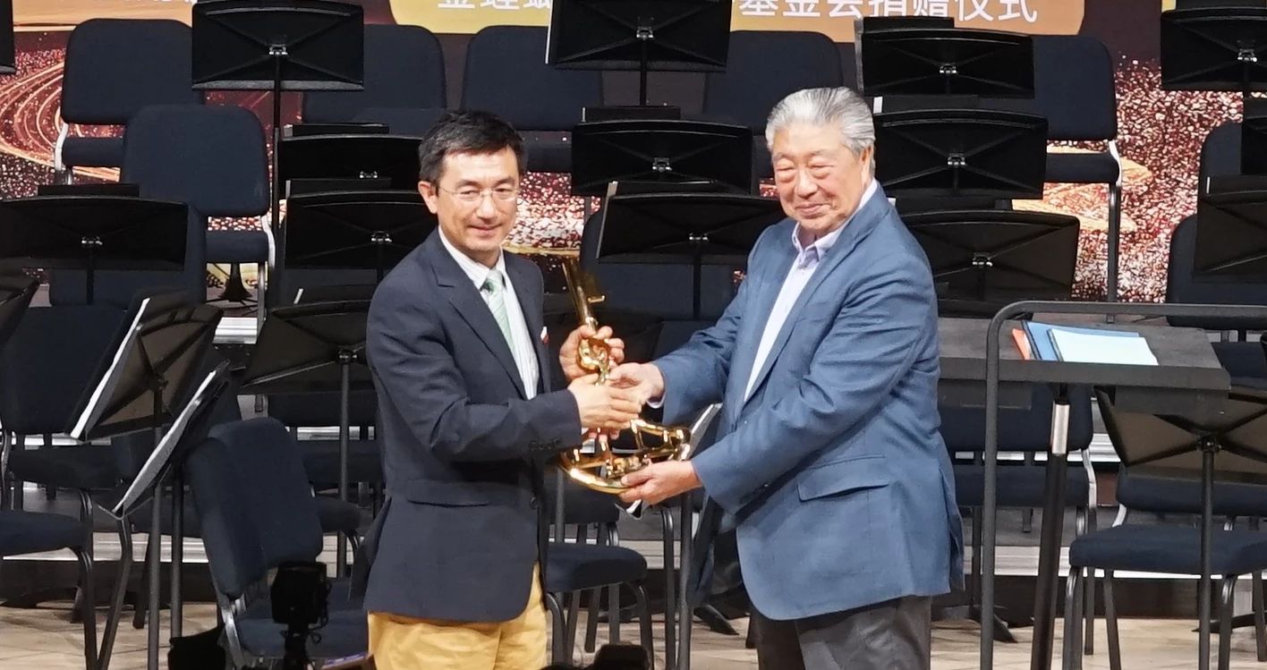 苏州大学校长、苏州大学校友总会会长熊思东教授接受朱恩馀先生赠与的象征恩玲艺术中心正式启用的钥匙