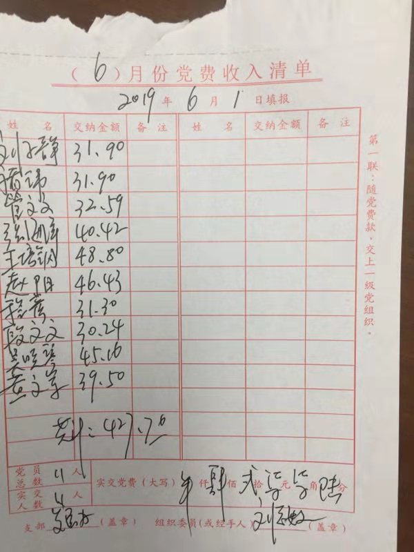 发展办党支部2019年6月党费收缴清单