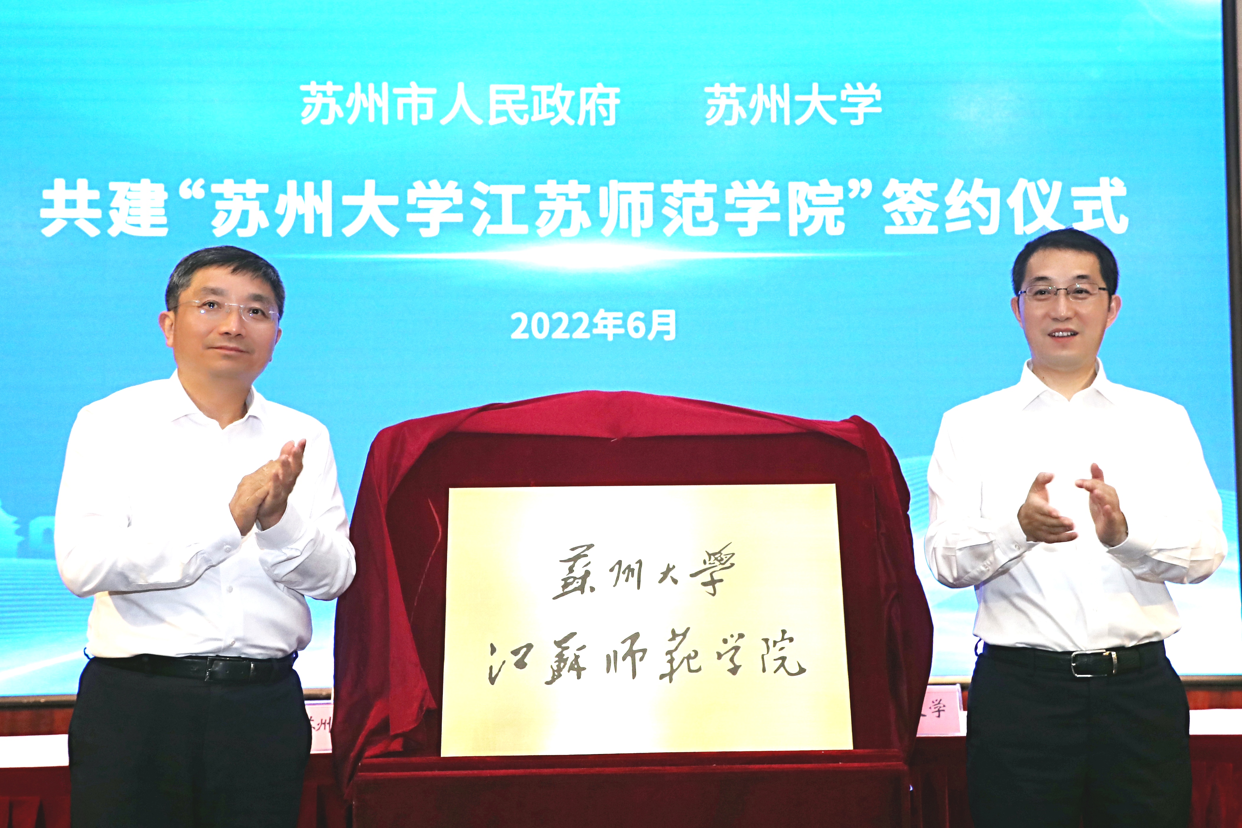 6月26日,苏州市人民政府与苏州大学共建“苏州大学江苏师范学院”的签约仪式在红楼会议中心学术报告厅举行。教育部教师工作司司长任友群,苏州市委副书记、市长吴庆文,苏州市副市长季晶,苏州市政府秘书长陈羔,苏州市政府副秘书长谢飞 ,苏州市教育局局长周志芳,苏州市财政局局长刘小玫,苏州幼儿师范高等专科学校校长杨建良,我校党委书记江涌、校长熊思东,校党委常委、副校长沈明荣、姚建林等出席活动。苏州市教育局相关部门负责人,我校相关职能部门负责人、相关学院领导和师生代表,以及苏州大学实验学校和附属学校的领导参加了签约仪式。仪式由副校长沈明荣主持。