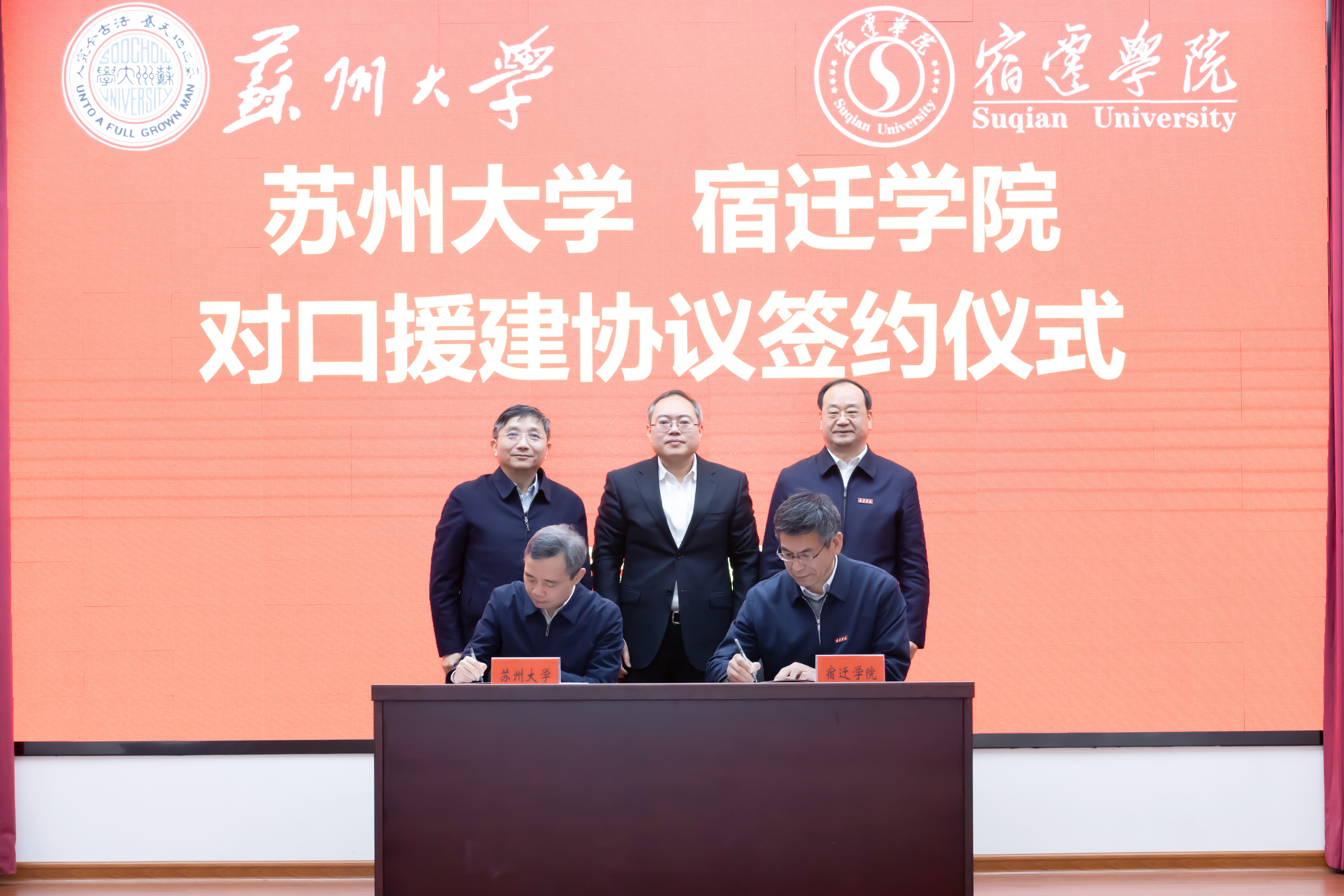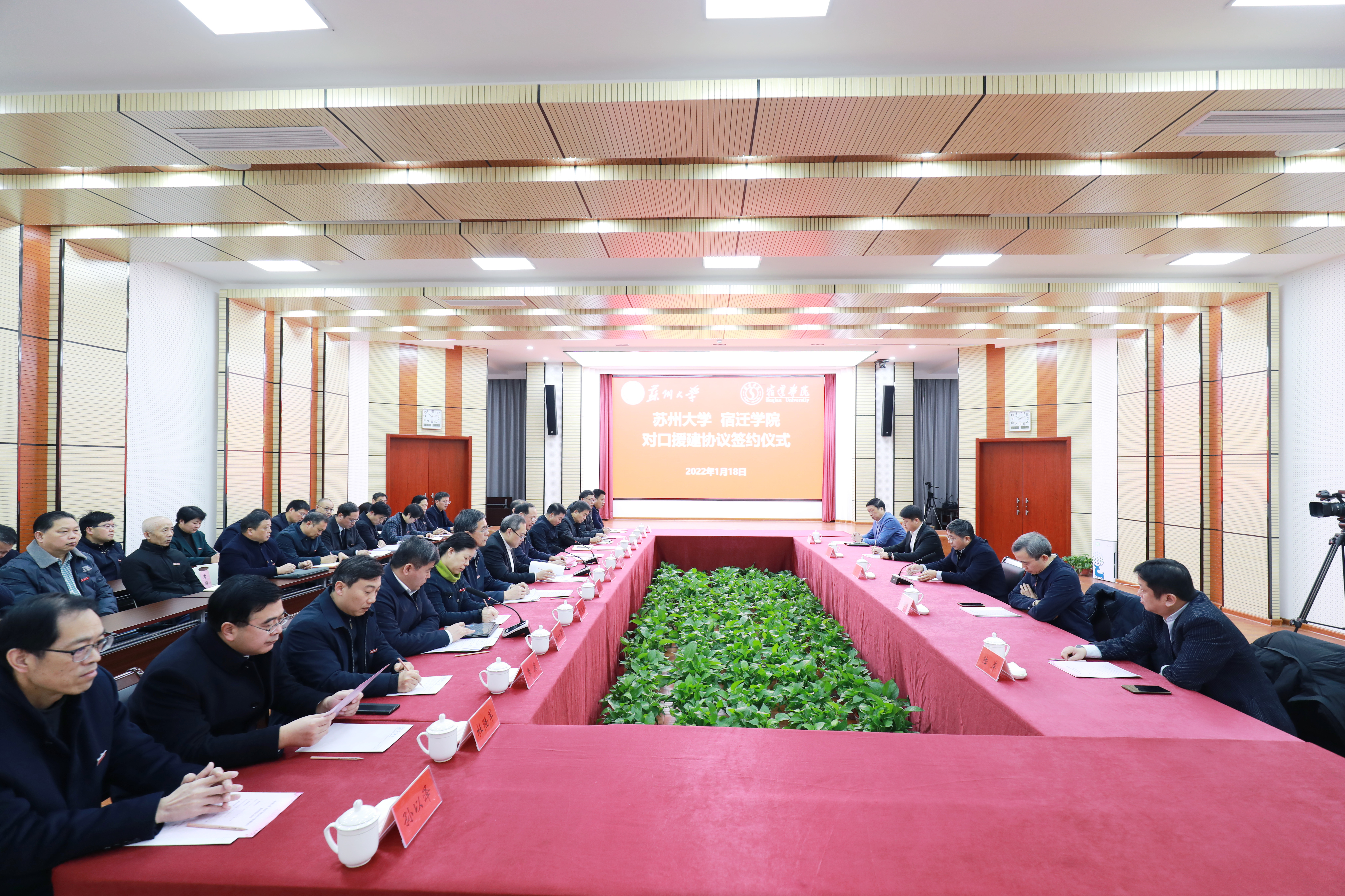 1月18日上午,苏州大学对口援建宿迁学院签约仪式在宿迁学院举行。校党委书记江涌,党委常委、副校长沈明荣,宿迁市委常委、常务副市长张明康,宿迁学院党委书记徐德、校长刘志远等全体校领导出席仪式。