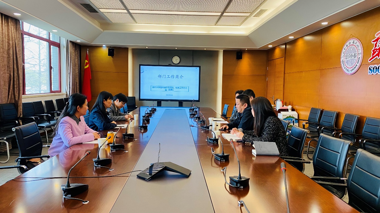 陆岸介绍了苏州大学国内合作发展处、校友工作办公室的部门概况。随后徐冉从如何更好地实现服务校友、服务学校、服务社会的角度出发,详细介绍了我校校友工作的基本现状、难点及未来方向;刘子静从如何拓宽筹资渠道、如何提高筹资积极性角度出发,全面介绍了苏州大学教育发展基金会的基本情况、工作重点。双方就校友工作、基金会工作开展了深入的交流和探讨。