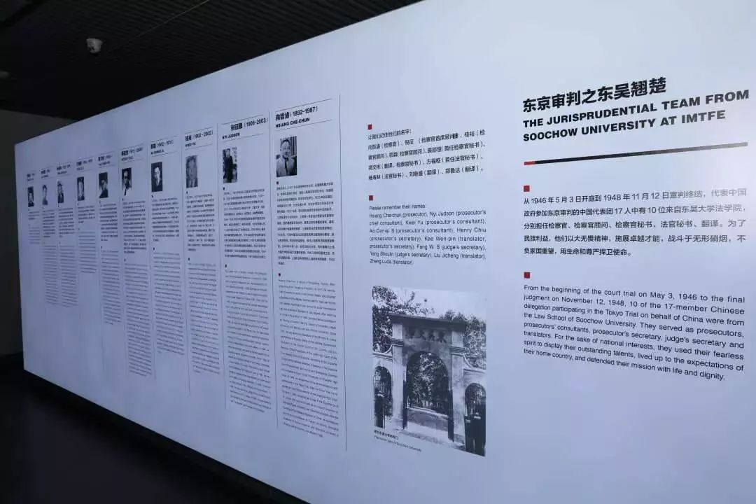 从1946年5月3日开庭到1948年11月12日宣判终结,来自东吴大学的10位法官和检察官,他们是向哲濬(检察官)、倪征 日奥(yù)(检察官首席顾问)、桂裕(检察官顾问)、鄂森(检察官顾问)、裘邵恒(首任检察官秘书)、高文彬(翻译、检察官秘书)、方福枢(首任法官秘书)、杨寿林(法官秘书)、刘继盛(翻译)、郑鲁达(翻译)。为了民族利益,他们以大无畏精神,施展卓越才能,战斗于无形硝烟,不负家国重望,用生命和尊严捍卫使命。