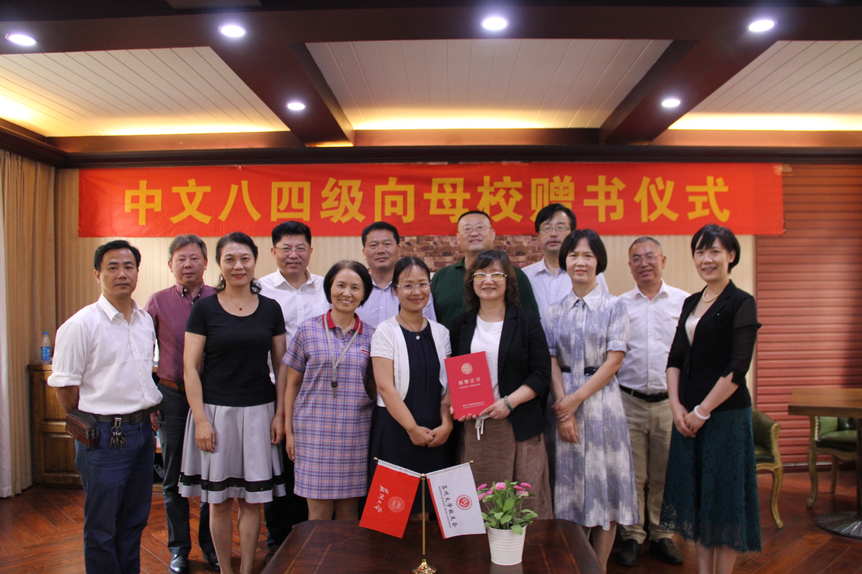 胡新华向中文八四级的校友代表颁发了捐赠证书,发展办、文学院、图书馆、档案馆、档案馆等部门分别接受了校友们捐赠的图书。