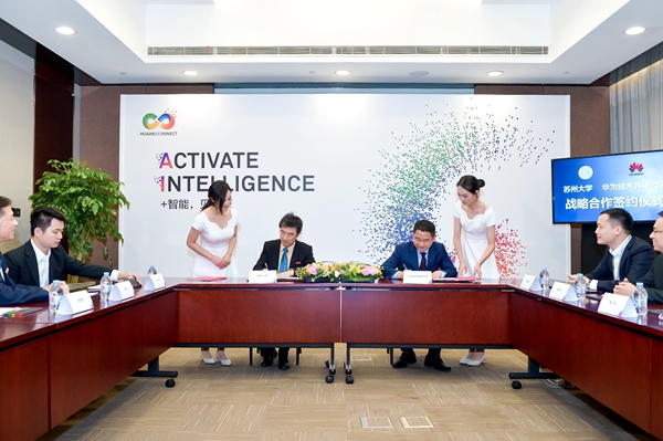 10月10日,苏州大学与华为技术有限公司战略合作框架协议签约仪式在上海世博中心举行。双方本着“联合、互补、共赢、发展”的原则,面向信息技术和高等教育发展未来,共同致力于打造一个镜像化、数字化、智能化的“云中大学”,并在人才培养、科研合作、成果转化等领域开展全面合作。 华为技术有限公司EBG中国区副总裁杨萍、企业业务江苏区总经理鲁伟、企业业务中国区教育业务部部长张夷、企业业务苏州区总经理江文淼、企业业务苏州区副总经理秦亮,我校校长熊思东、副校长杨一心,以及校长办公室、信息化建设与管理中心、国内合作办公室等部门负责人参加了签约仪式。