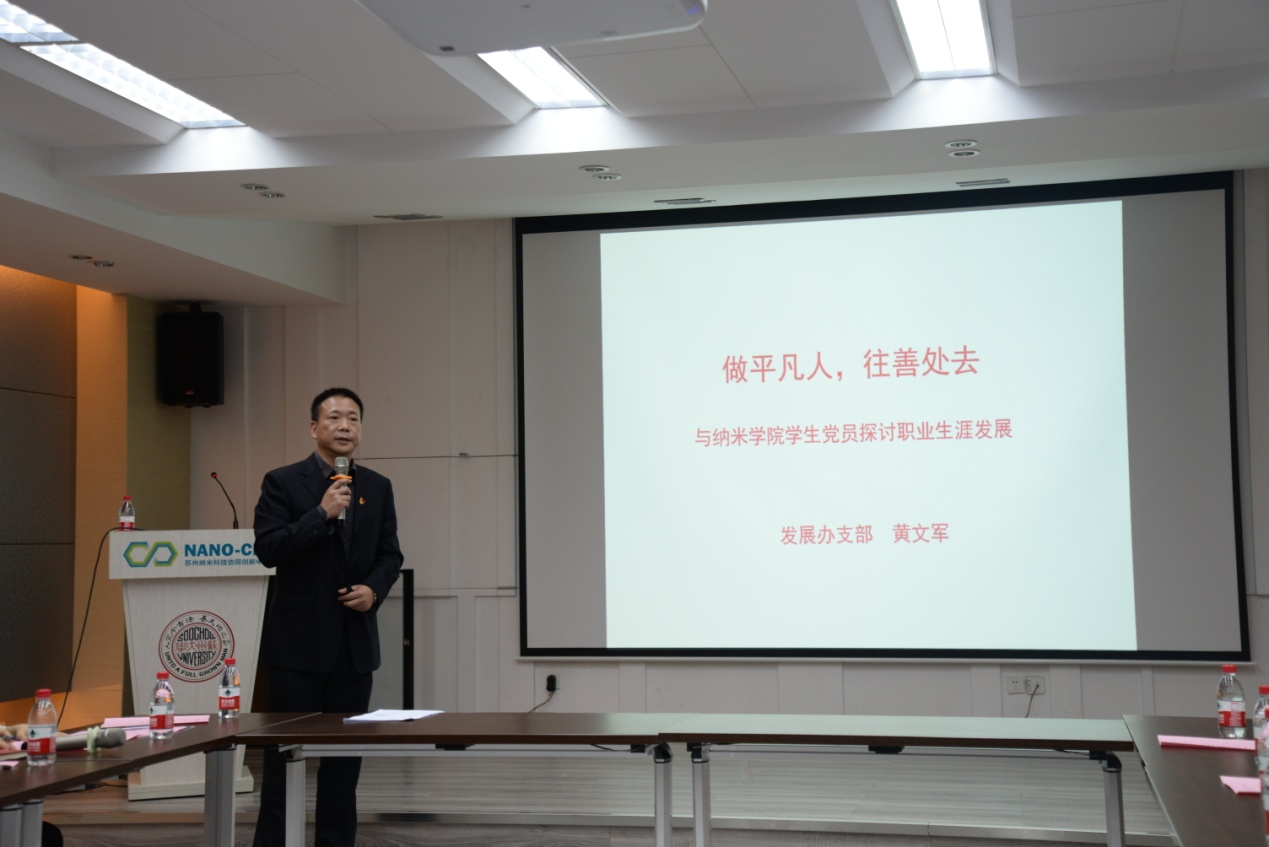 随后,发展办党支部黄文军同志做了《做平凡人,往善处去》的主题报告,从大学排名的雇主评价指标讲起,结合多年工作经历和感悟,针对职业规划、人生规划和职业技能等多方面做了详细和深刻的阐述,与纳米科学技术学院学生党员探讨职业生涯发展。他希望,纳米科学技术学院的同学们在大学里着力培养四种能力:有效思考、沟通、做适当的判断、对价值的认知,从而形成某些价值、态度、知识和技能,为未来达到恰当舒适和丰富美满的生活做准备,利用在校时间充分做好时间规划,行动起来,丰满自己的智能、发展能力,形成与自己相匹配的核心竞争力,从在校学生走向行业精英。