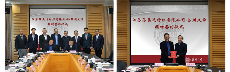 随后,何隽与张克勤共同签署了《战略合作框架协议》,王申涛与胡新华签署了《捐赠协议》,沈明荣向王申涛颁发了《捐赠证书》。为支持纺织专业学科建设,纺织公司将在苏州大学纺织与服装工程学院设立苏美达奖学金、奖教金,用于奖励在学科建设、技术研发、人才培养等方面表现突出的优秀学生及教师。