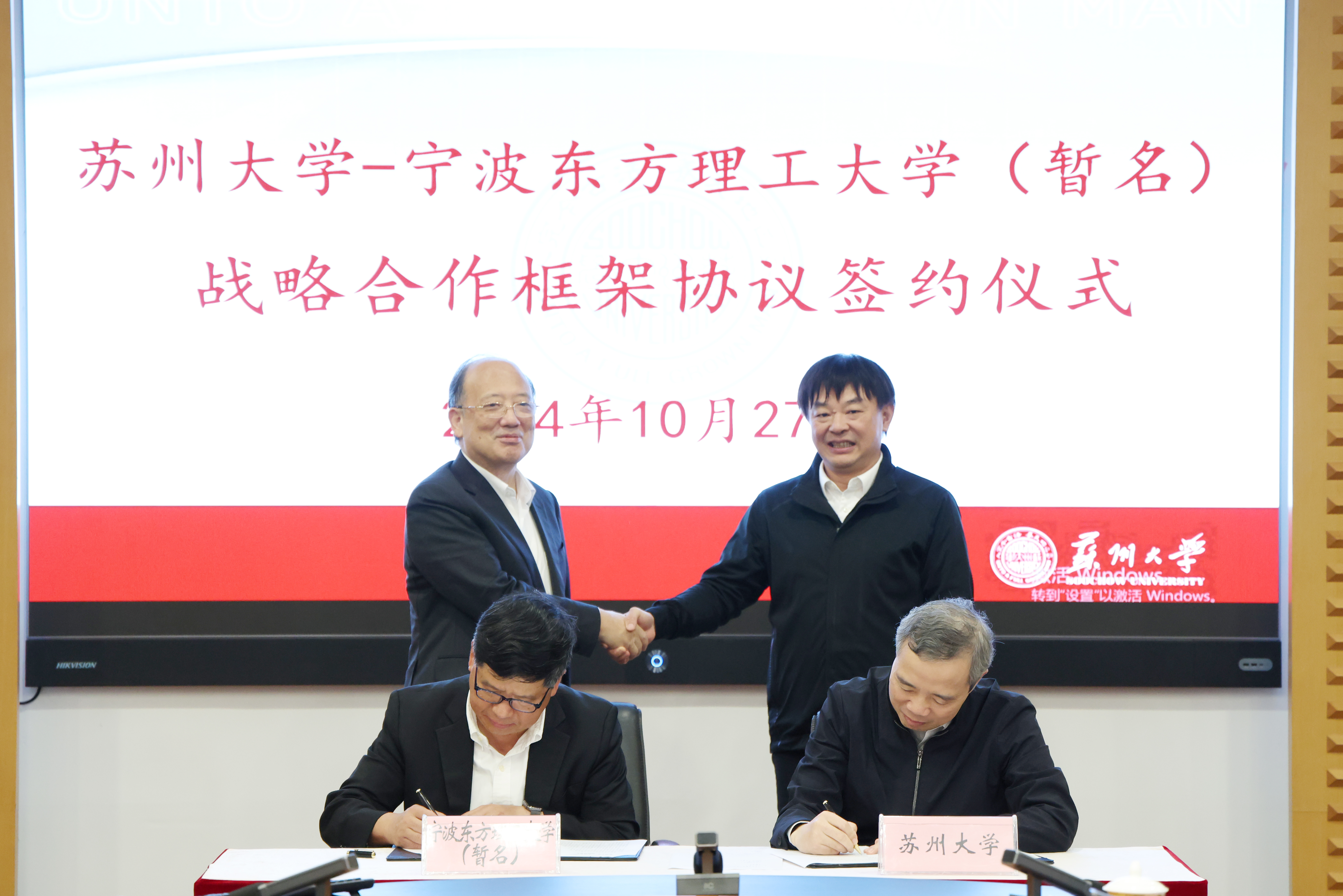 10月27日下午,苏州大学—宁波东方理工大学(暂名)战略合作框架协议签约仪式在我校天赐庄校区红楼会议中心举行。宁波东方理工大学(暂名)校长、中国科学院院士陈十一,我校校长、中国工程院院士应汉杰出席。我校党委副书记、副校长沈明荣,校党委常委、副校长姚建林,宁波东方理工大学(暂名)副校长郑春苗,以及两校相关职能部门负责同志参加签约仪式。仪式由姚建林主持。