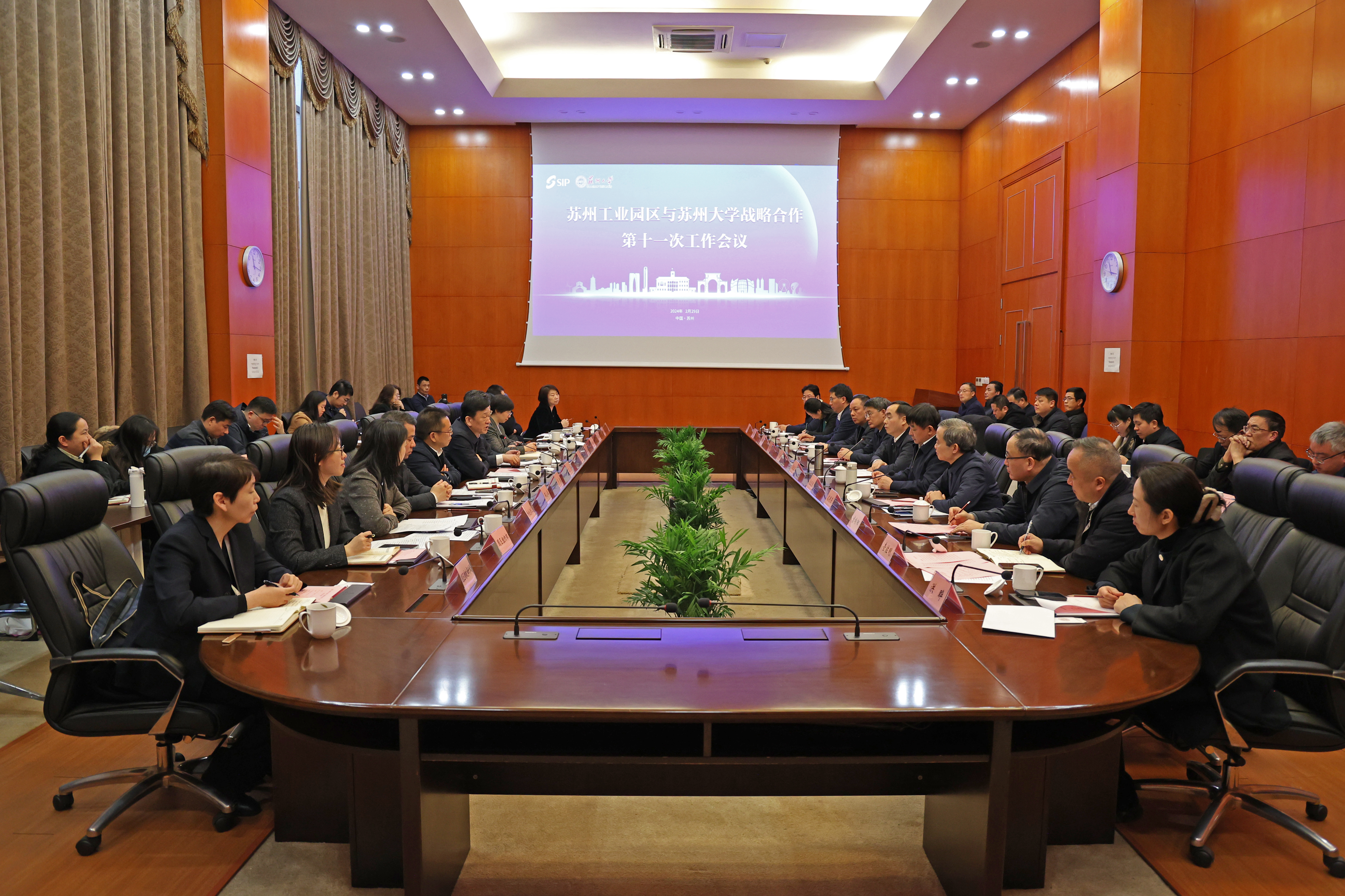 2月29日,苏州工业园区与苏州大学战略合作第十一次工作会议在独墅湖校区召开。校地双方全面深化战略合作,共同打造大学和城市高质量发展的命运共同体,推动校地融合发展再上新台阶,加快开放创新的世界一流高科技园区建设。 苏州市委常委、苏州工业园区党工委书记沈觅,苏州工业园区党工委副书记、管委会主任吴宏,我校党委书记张晓宏,校长、中国工程院院士应汉杰出席会议并讲话。园区党工委、管委会领导卢渊、杨帆、邹小伟;我校校领导邓敏、沈明荣、姚建林、宫向阳、李孝峰、查佐明、洪晔、吴嘉炜;园区及我校相关部门负责人参加会议。