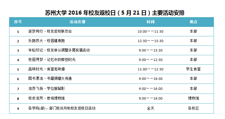 2016校友返校日将于5月21日举行,欢迎校友们以班级、年级组团集体返校或个人返校,如有意向欢迎与我们联系。我们准备了各类丰富多彩的活动等待您的参与。具体活动安排请关注苏州大学校友会网站、微信、微博,我们将及时发布相关信息,您也可以给我们的活动组织策划提出宝贵建议。