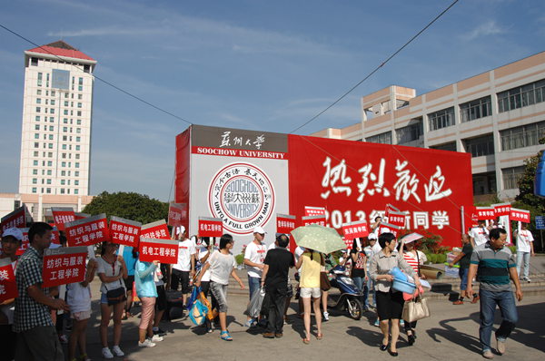 23日,苏州大学新生报到开始了。早上六点左右,独墅湖校区炳麟图书馆前就开始热闹起来了,各个学院的志愿者忙前忙后,他们个个满脸的喜悦,迎接着新同学的到来。