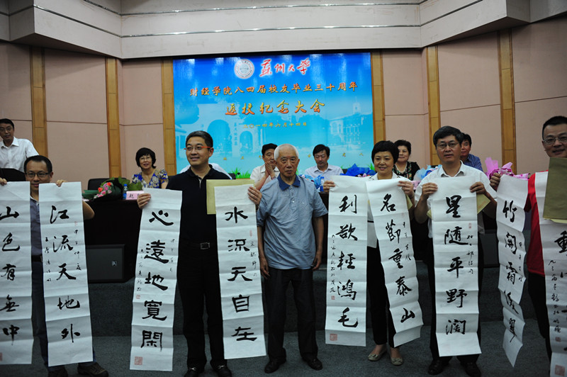 93岁高龄的书法家李鹤云老师深受师生敬仰,他不顾年龄高迈,为一百三十多名八四届同学每人准备了一幅书法作品,当场赠予学生代表,此举深深感动着每位校友,校友代表也以纪念宣纸回赠李老师。
