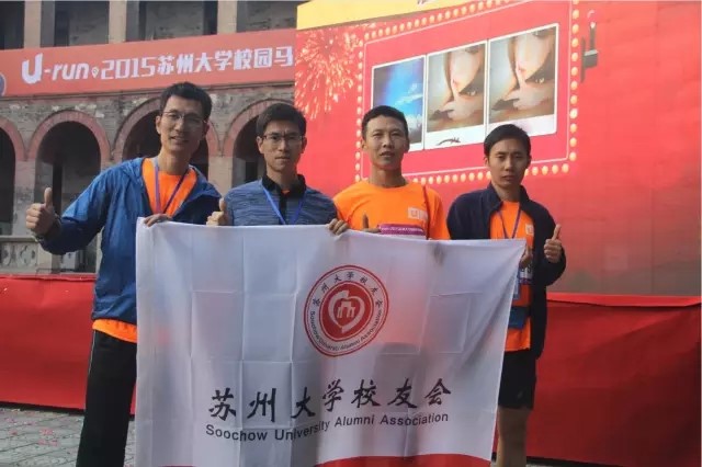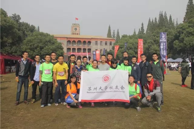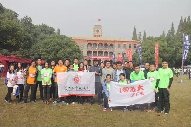 在今年的校园马拉松赛中,校友会特地选派了“苏州大学校友工作志愿者协会”的学生志愿者,为校友们提供了贴心周到的后勤服务工作和温馨细致的校友材料袋,并且还建立了参赛校友微信群,为校友们实时提供咨询服务。上午十一点多,便陆续有校友来到钟楼前草坪上的“校友、校董报到处”,他们在此登记校友信息、合影留念、感怀母校,并为接下来的马拉松比赛做准备。02广告的校友们还特地组团返校参加了此次活动。