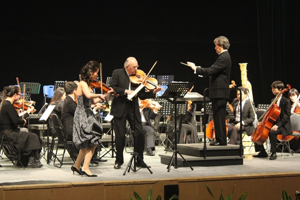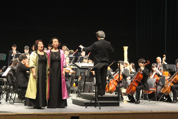 随后,苏大交响乐团演绎了法国作曲家比才的《卡门序曲》,刚刚加盟我校音乐学院的新教员——前伦敦皇家交响乐团中提琴首席Paul Silverthorne大师与音乐学院教员青年小提琴家宋歆予联袂合作奥地利作曲家莫扎特《降E大调交响协奏曲》。另一曲《G大调第94交响曲》“惊愕”选段,急缓有致,快慢错落交织,终了之刻仍余音袅袅,不绝如缕。中国著名女中音歌唱家杨光与女高音歌唱家李秀英携手演唱歌剧《女人心》、《诺尔玛》中的选段,将整场音乐会推向高潮。她们高亢嘹亮的歌声与时急时缓的交响乐和谐地融为一体。唱至动情处,两位艺术家手挽手,相互对视,表情生动而极富表现力。