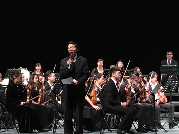 朱秀林向全场观众致以新年的祝福。他表示,音乐是最美妙的世界语言,为全球各国人民架起沟通的桥梁,可以将全球各地怀有善良、美好愿望的人民凝聚起来,开阔视野,围绕着真、善、美而敞开心扉。今晚的工业园区,不仅是一座科技、工业之城,也是一个艺术之城。我校与苏州独墅湖科教创新区管委会携手打造2016年新年音乐会,就是要将苏州特有的温柔婉转、开放圆融的一面展示给大家,为苏州市民提供高雅的艺术享受,让音乐滋润生活。