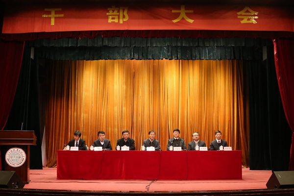 1月15日下午,我校在天赐庄校区敬贤堂召开全校干部大会,宣布省委关于我校领导班子调整的决定。副省长曹卫星,省委组织部副部长胡金波,省委教育工委副书记潘漫,苏州市副市长王鸿声,省委组织部干部五处处长封春晴,省委教育工委组织处处长眭平,苏州市委组织部副部长、老干部局局长周昌明等出席了会议。我校领导班子成员、正校级调研员,校长助理;离退休原正职校领导,近五年来退职校领导;校党委委员、纪委委员,全校在职正、副处职干部,区级及以上党代表、人大代表、政协委员,校各民主党派主要负责人,校学术委员会委员等参加了本次会议。