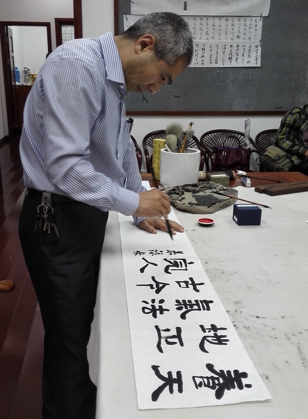 在谈笑风生中,几位社长兴致勃勃,拿起毛笔,挥毫弄墨。他们的书法作品将在6月份即将举办的2016苏州大学学生书画作品精品展中作为起首作品参展。
