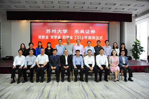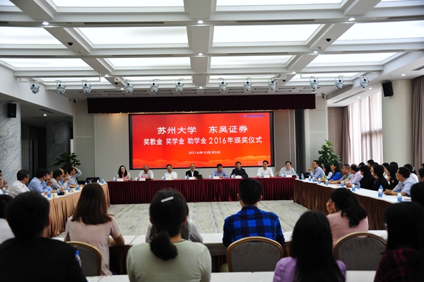 5月30日下午,苏州大学东吴证券奖教金、奖学金、助学金颁发仪式在东吴证券大厦隆重举行。东吴证券党委书记、董事长、总裁范力,党委委员、纪委书记、副总裁马震亚,党委委员、副总裁任少华,副总裁、董事会秘书魏纯,公司高级专务林峰,纪委副书记、监察室主任杭五一;我校党委书记王卓君,校长熊思东,副校长杨一心,党委办公室主任张国华,校长办公室主任曹健,人事处处长刘标,学生工作部(处)处长陈晓强,研究生工作部部长宁正法,发展委员会办公室主任赵阳,东吴商学院领导班子,获奖师生以及受助学生共同出席了颁发仪式。颁发仪式由东吴商学院党委书记王永山主持。