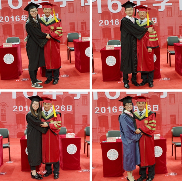 现场,毕业生身着庄严的学位袍,30人一组陆续登台,主礼教授依次为学位获得者授予学位证书、扶正流苏,并合影留念。