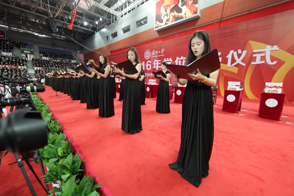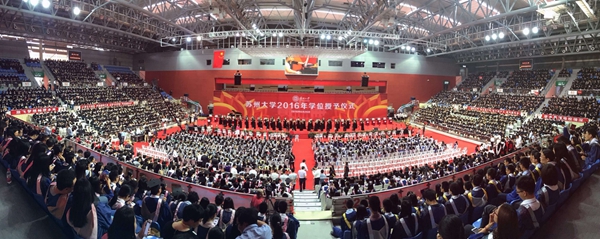 6月26日,苏州大学2016年学位授予仪式在独墅湖体育中心隆重举行。校领导熊思东、袁银男、田晓明、高祖林、江作军、蒋星红、陈卫昌,校学位评定委员会委员,全体毕业生、部分毕业生家属亲友代表,各学位评定分委员会成员、博士生导师、相关职能部门负责人、各学院(部)领导、教师与辅导员代表、后勤工作人员代表等近万人共同参加了本次盛大的学位授予仪式。