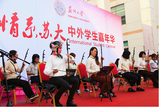11月18日下午,由我校海外教育学院主办,校内多个学院和职能部门以及钟楼社区、苏州工艺美院等多家校外友好单位共同参与协办的“情系苏大”中外学生嘉年华活动在东校区举行。来自40个国家的数百位苏大留学生与中国学生齐聚现场,带来了地道的异国美食和精彩的文艺表演。