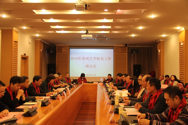 11月26日,2016年苏州大学校友工作研讨会在天赐庄校区举行。我校副校长、校友总会副会长田晓明,来自海内外30个校友分会负责人及学校各学院(部)校友分会负责人参加了此次会议。会议由发展委员会办公室主任、校友总会秘书长赵阳主持。