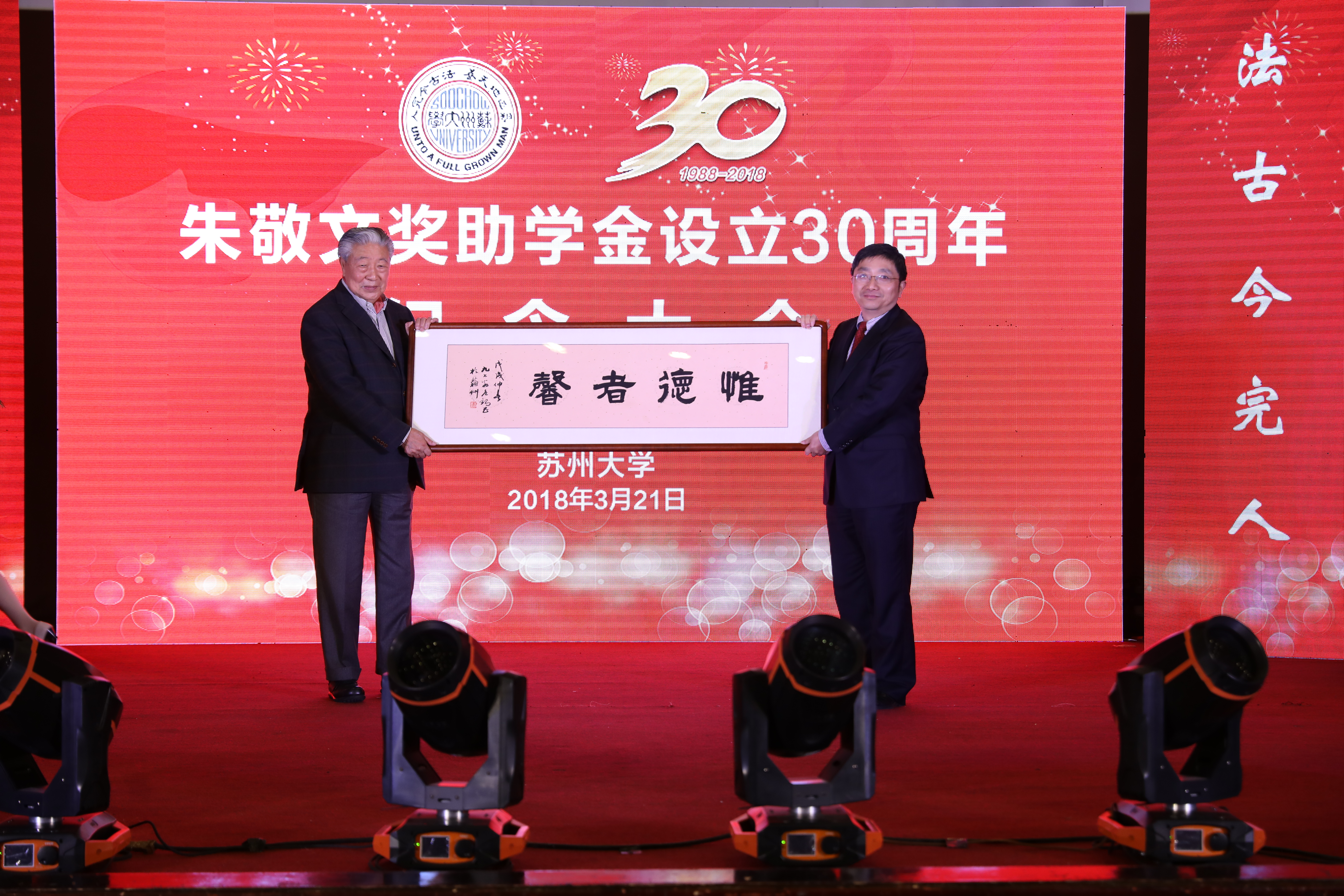 会上,与会领导、嘉宾和师生首先观看了苏州大学朱敬文奖助学金设立三十周年的微电影,共同回忆了三十年来朱敬文教育基金会在祖国大陆助学帮困的故事。作为香港著名的实业家,少年失学的朱敬文先生深知教育对于个人成才、社会进步、国家振兴之重要,早年就立下了助学报国的宏伟志愿。18岁时,经济稍得宽裕,他便着手将助学夙愿付诸行动,自此终生不辍。朱敬文先生仙逝后,长子朱恩馀等后人秉承先生遗志,继续以不同的方式资助祖国的教育事业,使敬文先生助学善举绵延至今90余载。