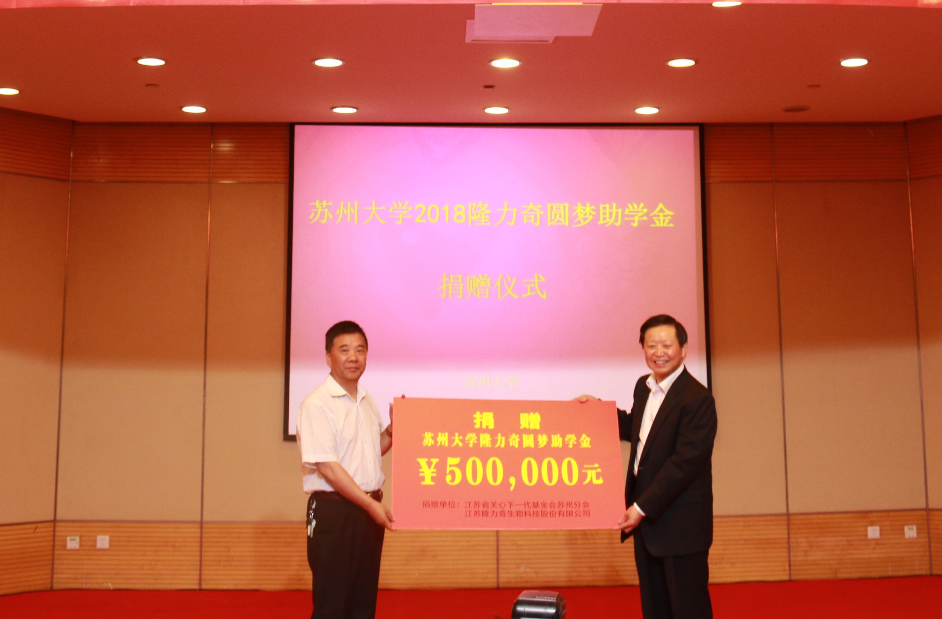 6月6日上午,苏州大学2018年隆力奇圆梦助学金捐赠仪式在苏州大学炳麟图书馆学术报告厅举行。江苏省关工委常务副主任、苏州市关工委名誉主任王敏生,苏州市关工委主任秦兴元,苏州市关工委常务副主任、市关心下一代基金会常务副理事长周德明,苏州市关工委副主任、市关心下一代基金会副理事长王溢,苏州市关工委副主任、市关心下一代基金会副理事长徐铭阳,苏州市关心下一代基金会秘书长汤伟民,江苏隆力奇生物科技股份有限公司董事长徐之伟伉俪,我校党委书记江涌,党委常委、党委办公室主任张国华,相关部门负责人,学院(部)负责老师以及我校100名圆梦助学金获助同学一同出席了此次捐赠仪式。仪式由党委常委、副校长刘标主持。