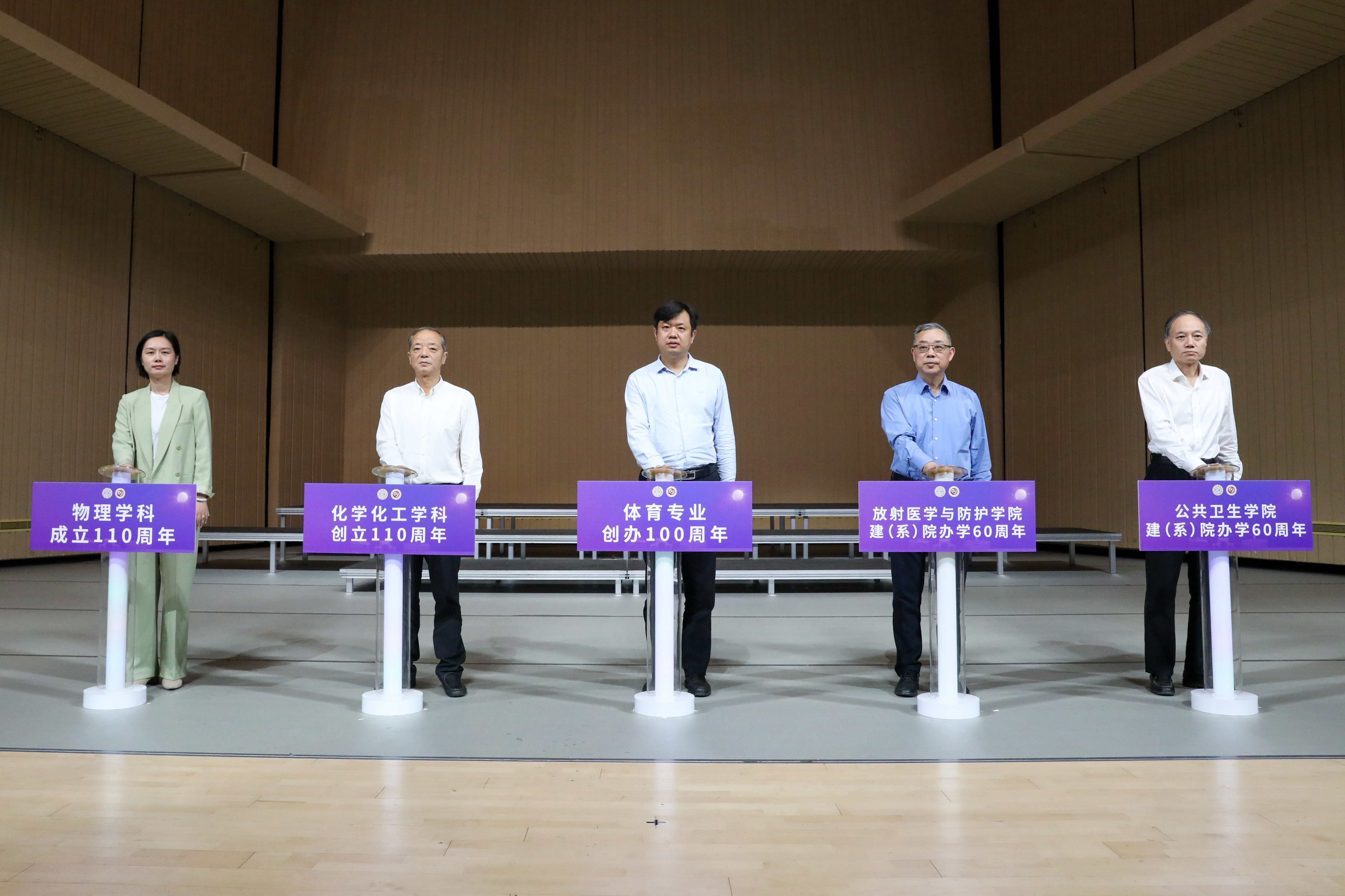 今年,不仅是苏州大学建校124周年,也是物理学科成立110周年、化学化工学科创立110周年、体育专业创办100周年、放射医学与防护学院和公共卫生学院建(系)院办学60周年。会上,物理科学与技术学院党委副书记谢燕兰、材料与化学化工学部党委书记李翔、体育学院副院长张大志、放射医学与防护学院执行院长曹建平、公共卫生学院院长张增利共同上台点亮周年纪念活动启动柱。各学院(部)将以师生校友为主体,从学术引领、人才荟萃、校友同庆等方面,开展一系列内涵丰富、务实简约的庆祝纪念活动。