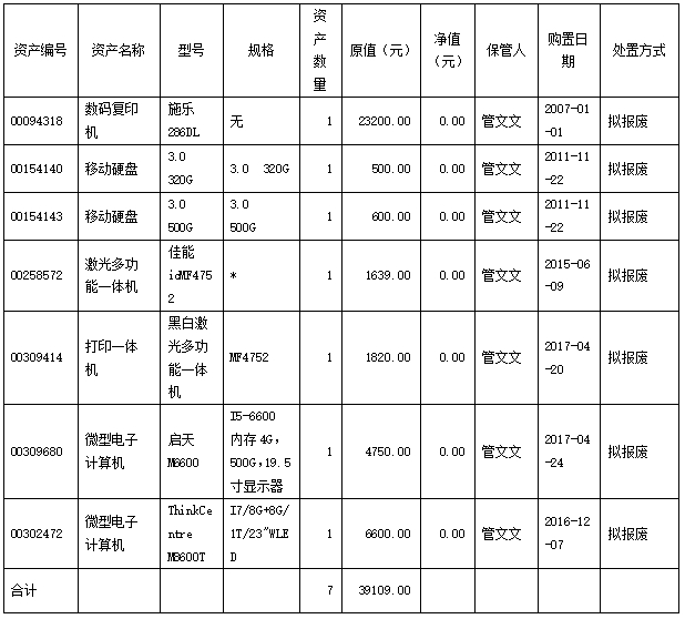 国内合作发展处拟报废固定资产如下,现进行公示: