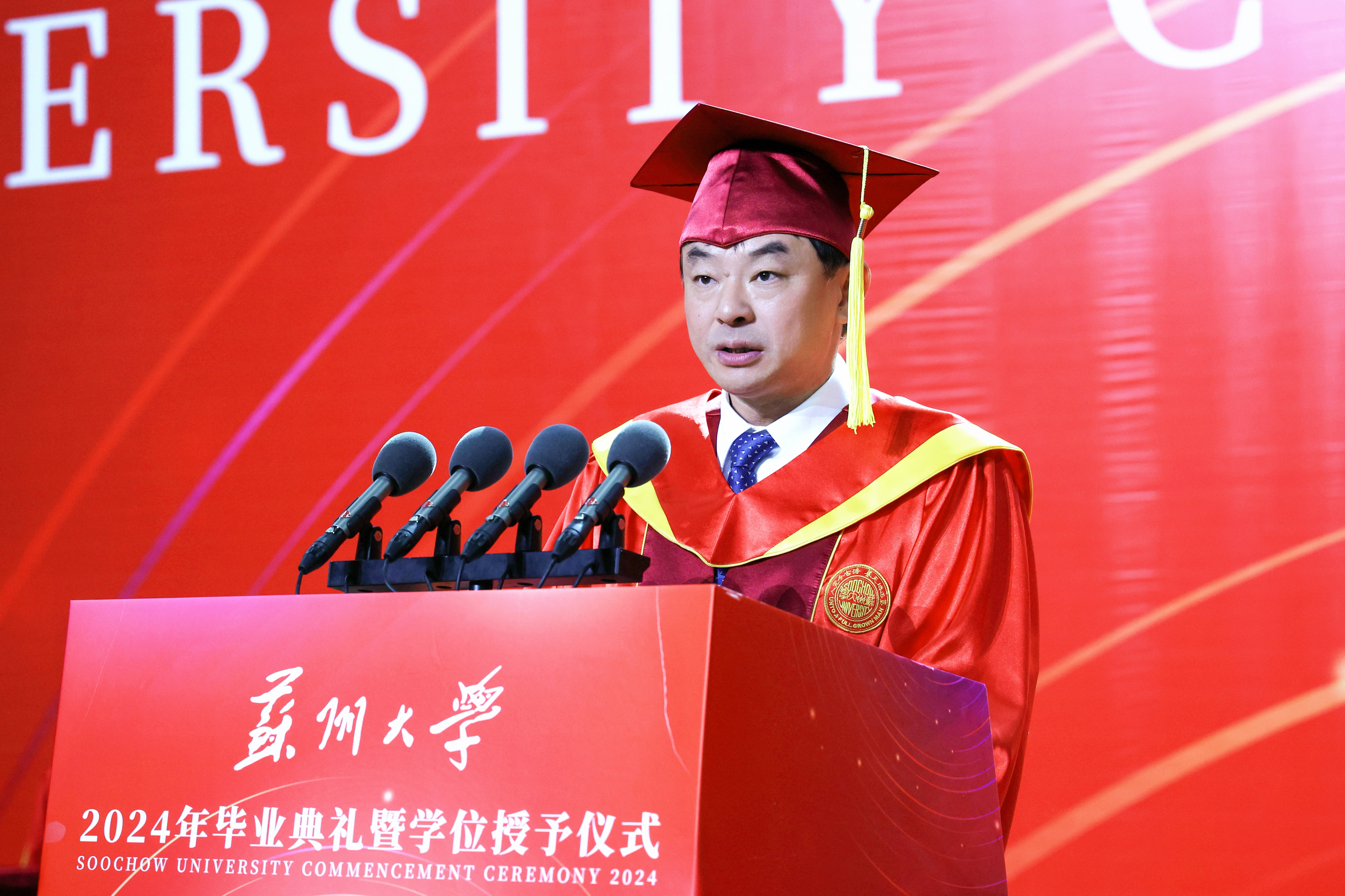教师代表、传媒学院执行院长陈龙对即将踏上新征程的毕业生送上了祝福与期望,希望大家能做一个正直、善良、拥有家国情怀的人,修炼青春、阳光、有理想、有担当的苏大学子气质,保持批判思维和创新头脑,开拓进取,谱写人生新的篇章!