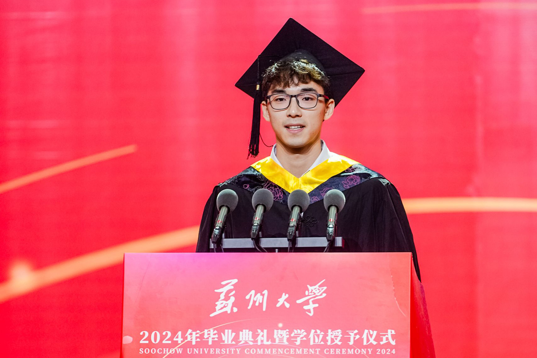 入学报到、军训、开学典礼、校园马拉松、歌手大赛、毕业双选会……大屏幕上循环播放着大学生活点滴回忆的暖场视频。《苏州大学2024年毕业典礼教师寄语》向同学们送去师长们情真意切的关心与祝福,《以毕业的名义表白》带领同学们再次回忆最美的校园时光,让人倍感温暖。