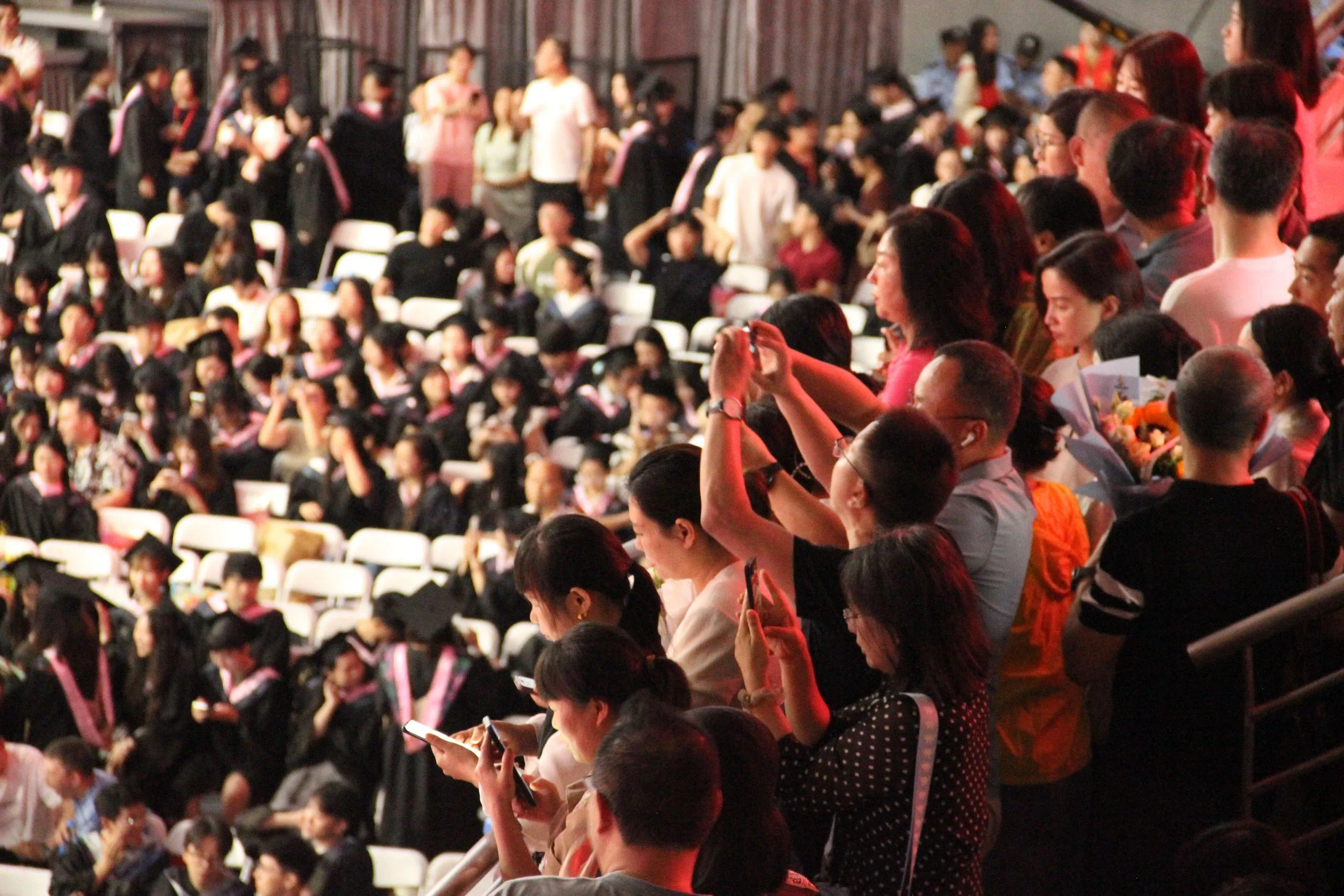 毕业典礼暨学位授予仪式在庄严的国歌声中拉开帷幕,全体出席人员起立唱国歌。