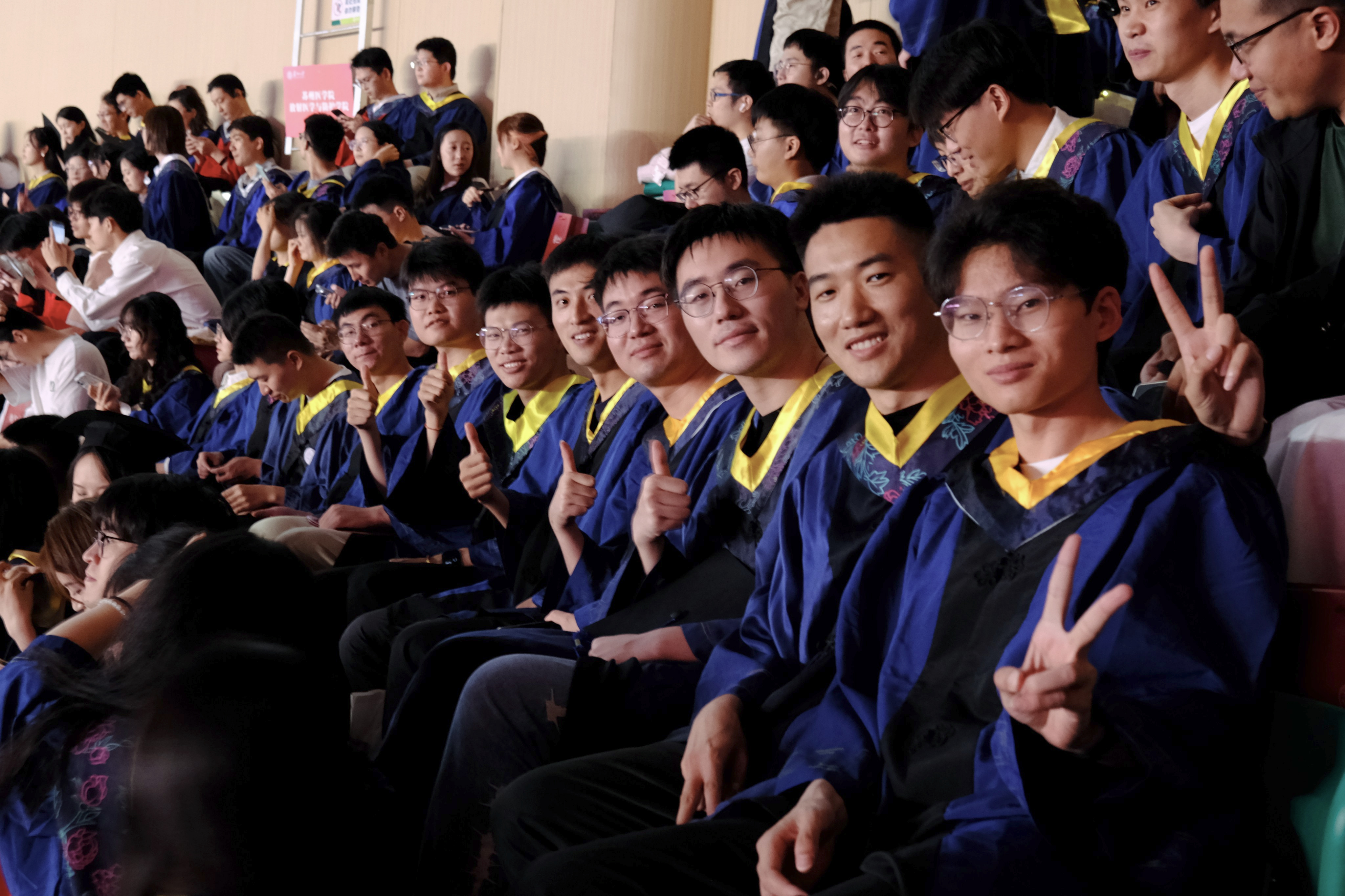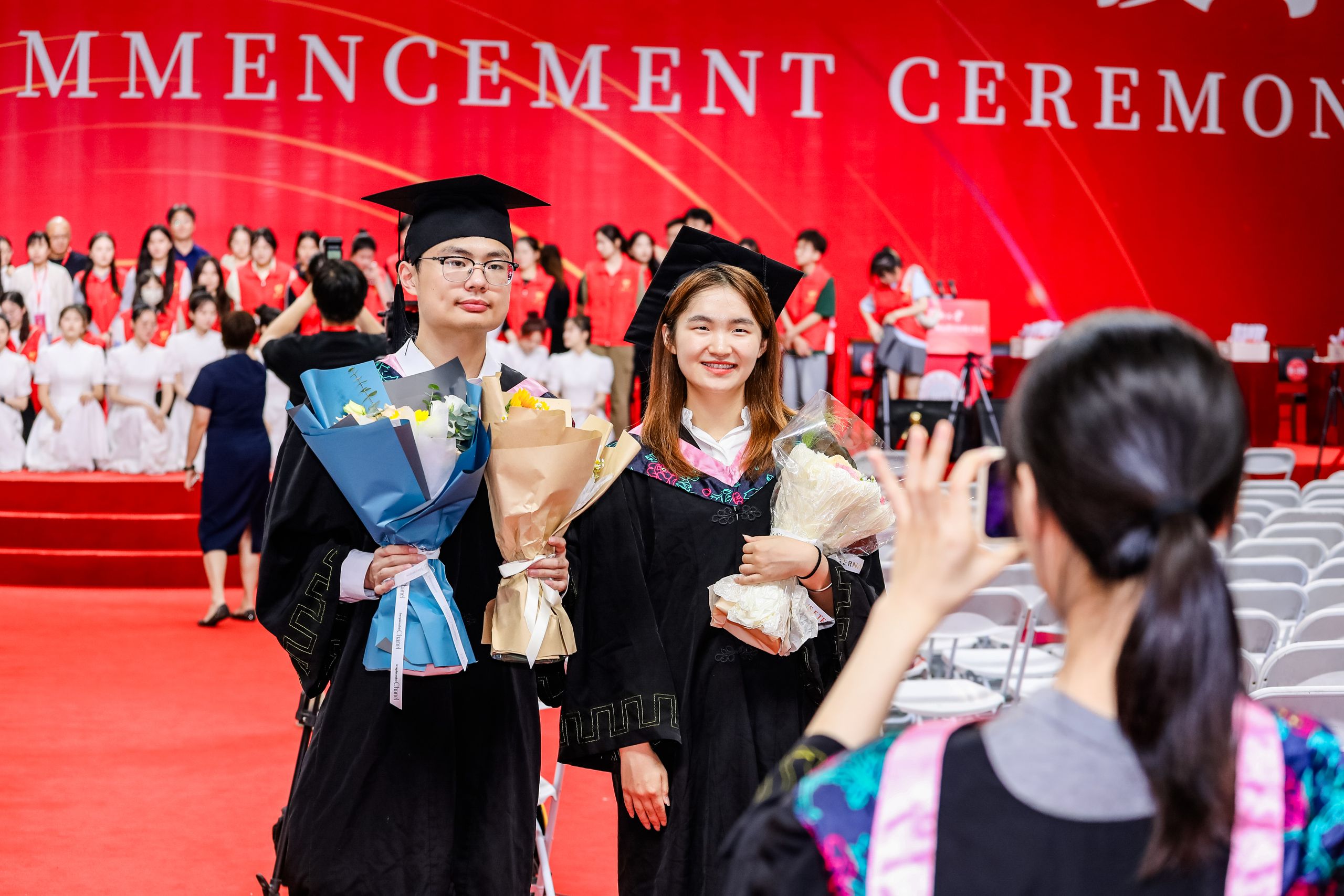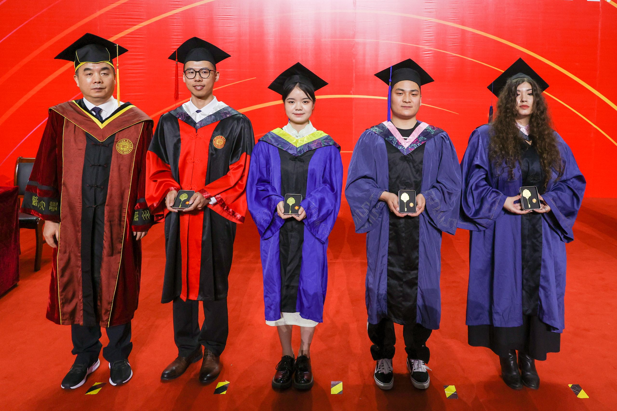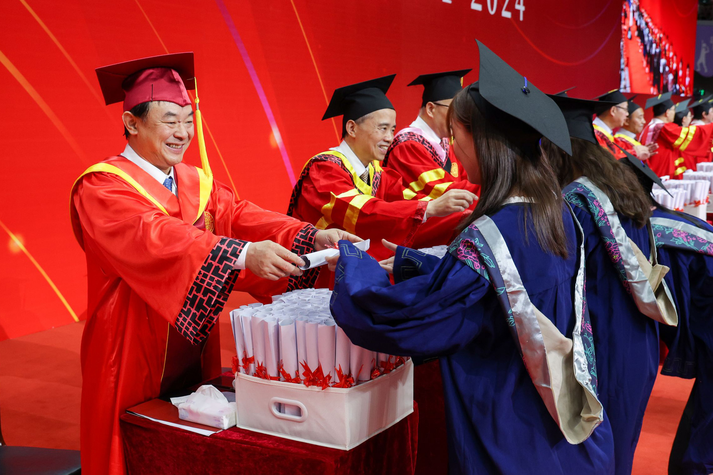 学位授予仪式上,毕业生们身着学位服,56人一组依次登台,主礼教授为学位获得者授予学位证书、扶正流苏,并合影留念。