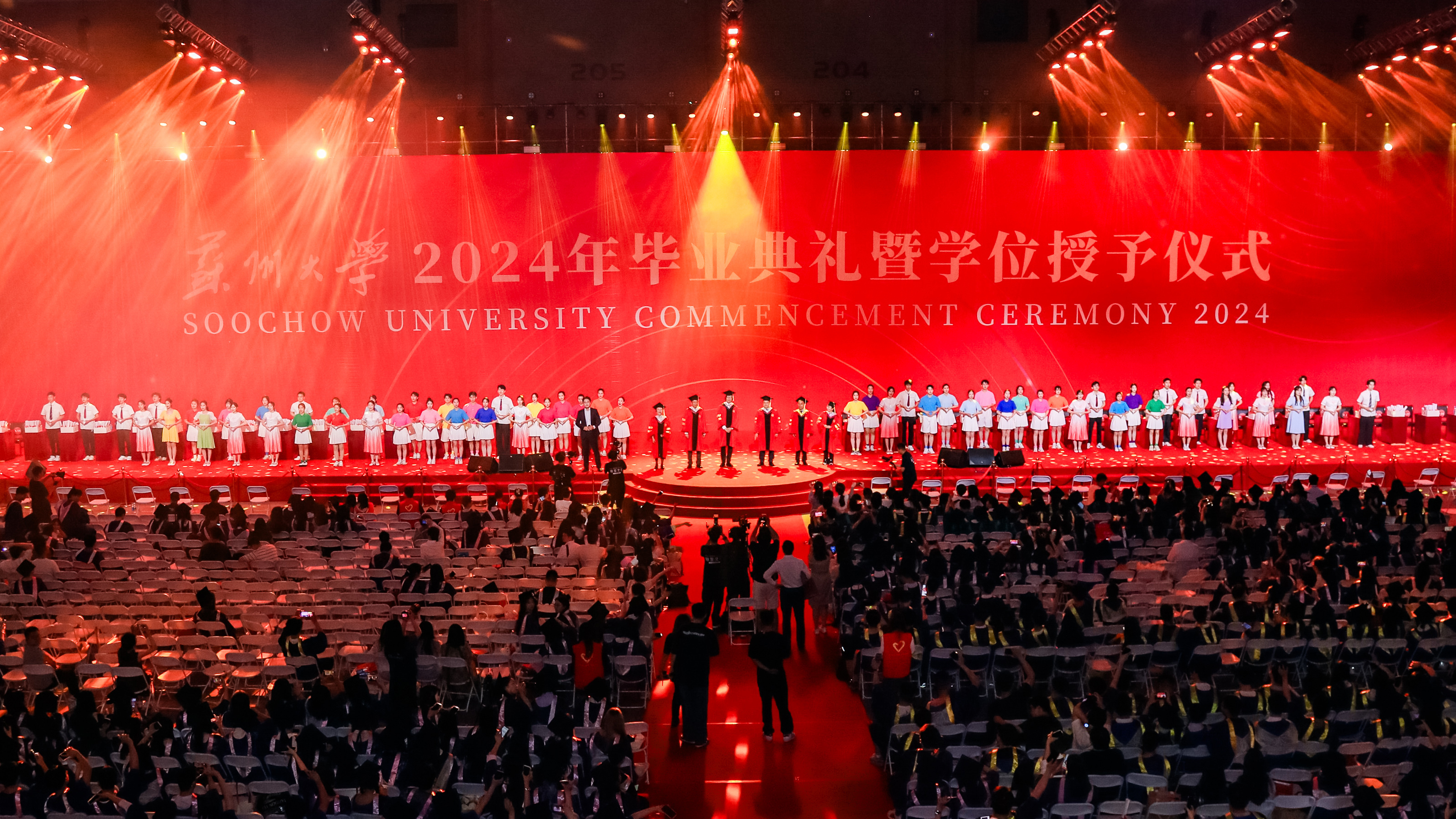 伴随着热烈的掌声,苏州大学2024年毕业典礼暨学位授予仪式礼成,主礼教授退场。走到了分别的路口,一首《我期待》,一首《送别》,唱不完同学们对母校的眷恋和对未来的憧憬。《歌唱祖国》的旋律响起,青春记忆和爱国情怀瞬间点燃,全场师生用最美的歌声祝福伟大祖国繁荣昌盛。