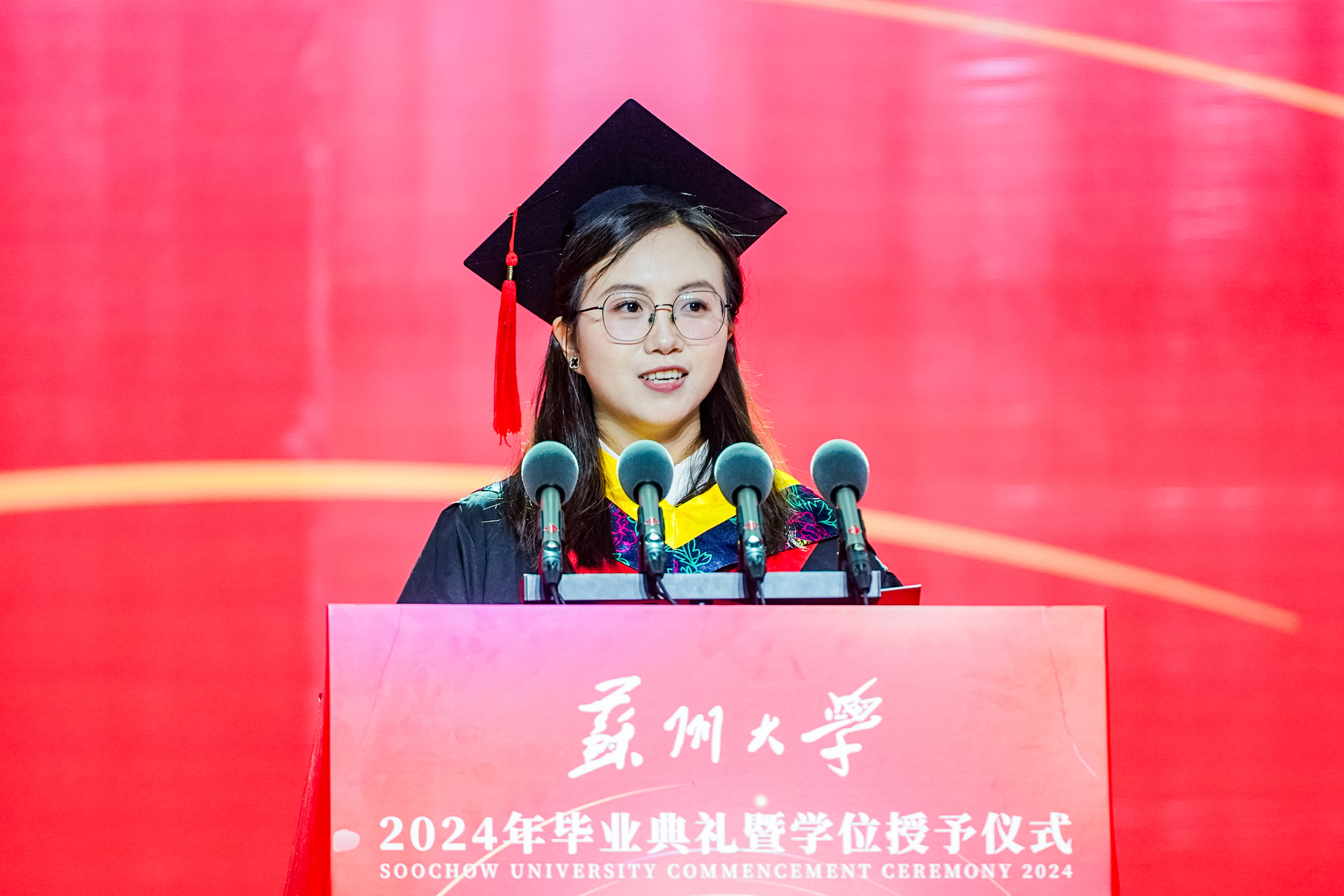 研究生代表、材料与化学化工学部2021级材料科学与工程专业博士研究生鲁坤焱,将她在苏大度过的9年时光比作不可复制的基因密码。她用奉献、拼搏、践行三个关键词概括了在苏大的成长之路、科研之路以及未来的奋斗之路。