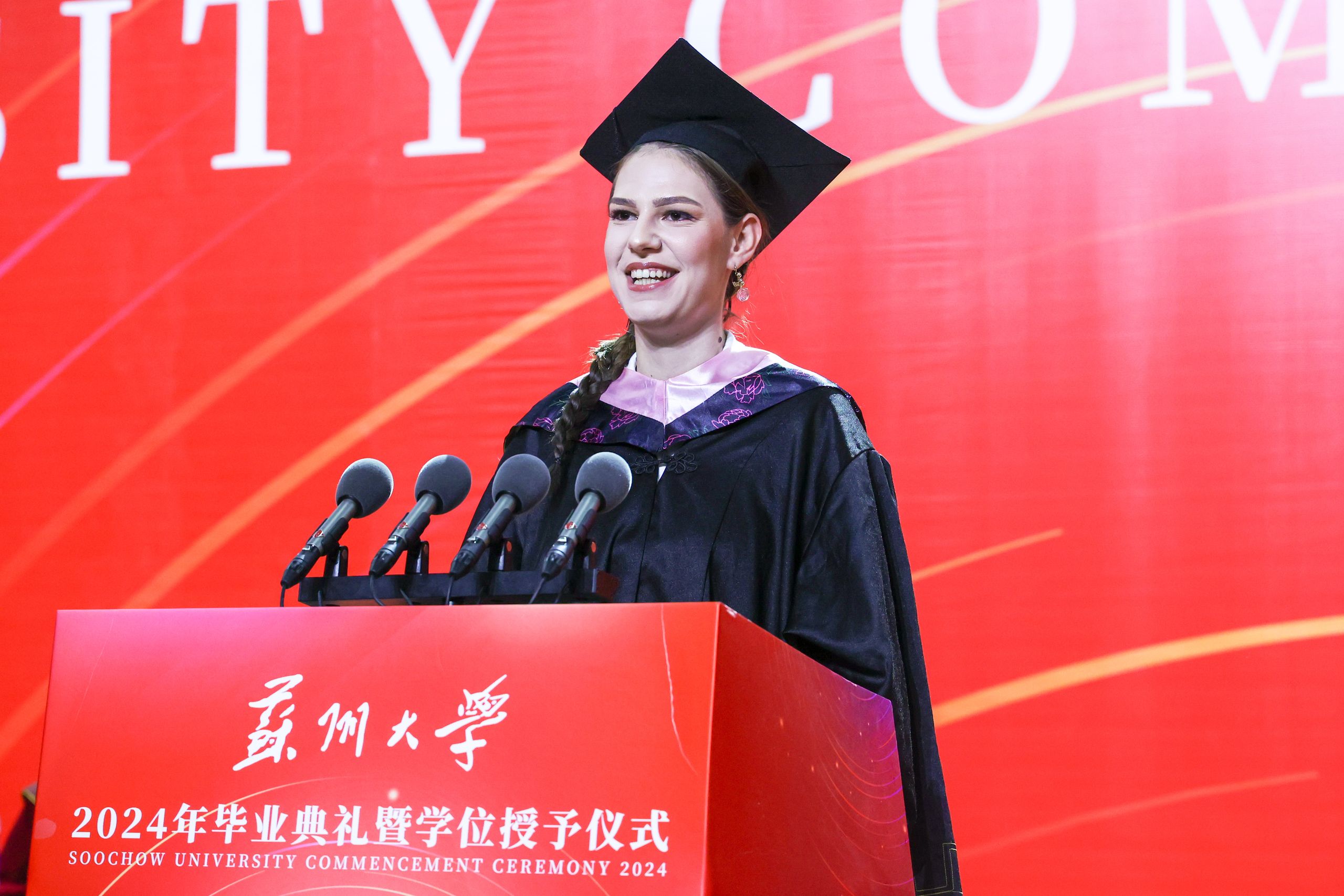 留学生代表、文学院2020级汉语言文学专业本科生马一诺,用一口流利的中文回忆了与苏州的相遇以及在苏大学习生活的点滴。她感谢学校给予留学生们体验中国文化魅力、感受中国发展力量的机会,也期待利用所学,为促进中国、波黑文化交流和国际友谊贡献力量。