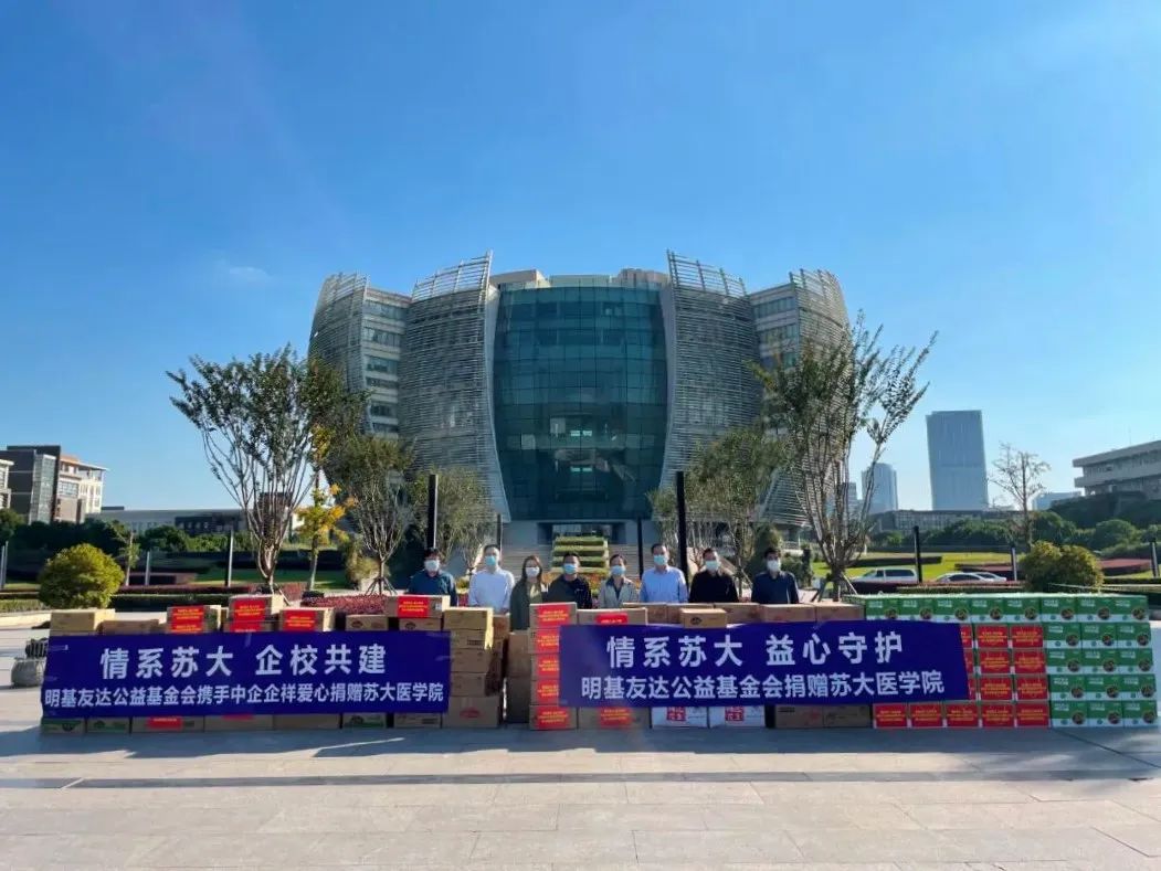 10月19日下午,苏州明基友达公益基金会携手中企企祥(苏州)科技有限公司将600余箱水果、食品和防疫物资运抵苏州大学独墅湖校区,捐赠给苏州大学苏州医学院,用于慰问坚守在校园内封闭的师生员工,助力学校疫情防控。苏州大学副校长吴嘉炜,国内合作发展处处长陆岸,苏州医学院党工委书记钱福良,苏州医学院党工委副书记、副院长孟玲玲等现场接受了捐赠物资。