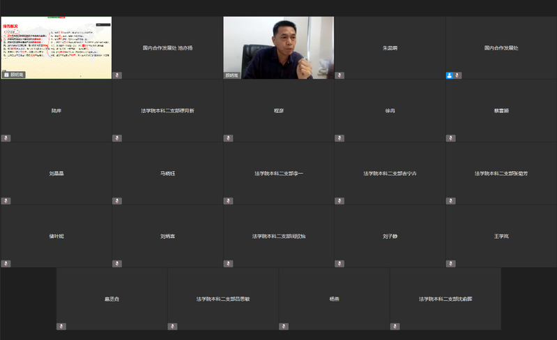 为深入贯彻党的二十大精神,扎实推进党员学习常态化、规范化,推动党的二十大精神进校园、进支部、进头脑,国内合作发展处、基金会、校友会党支部与法学院本科二支部于12月12日联合开展学习党的二十大精神活动,听取了音乐学院顾明高副院长题为“一起手挽手,建设现代化”的主题党课。线下纵横楼202室与线上Welink会议同步举行,双方支部全体党员共同参与,报告会由支部书记陆岸主持。